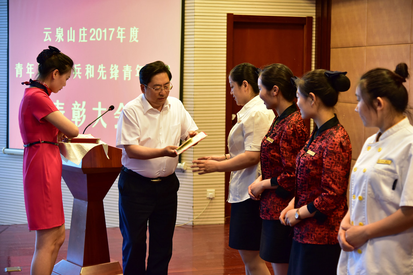 5月27日下午,云泉山庄召开2017年度青年服务标兵和先锋青年团队表彰大会,杨国华副总经理宣读表彰决定,李中亚总经理为获奖员工颁发证书。